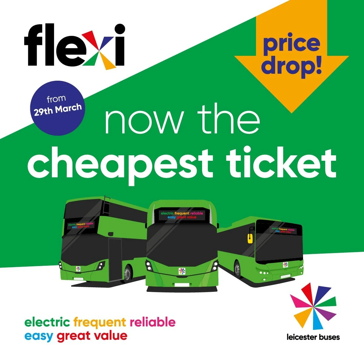 From 29th March 2026 the price of Flexi tickets are reducing by up to 20%, making it the cheapest ticket to travel on in the Leicester Flexi area. Bus companies are also removing their single operator only tickets, so that there is one ticketing range - Flexi - in place. This is helping to simplify fares, better integrate the network and give passengers an increased frequency by opening up travel on the whole bus network with one ticket.